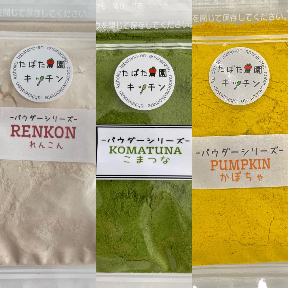 数年前から考えて取り組んでいましたが、沢山の方のおかげでR3年の春に「たばた農園キッチン」を開業することになりました。「たばた農園キッチン」では野菜のパウダー化を始め、新鮮な野菜をたっぷり使ったお惣菜やお菓子作りにも挑戦しております。獲れたて新鮮で栄養価の高い野菜を少しでも多くの方にお届けできたらいいなと思っております。